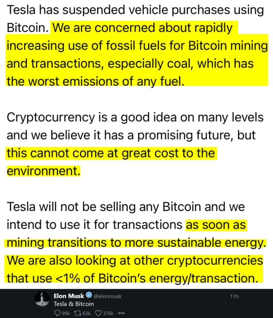 Putting aside the fact that it was tweeted by a guy who is equal parts visionary and charlatan, and this was the case long before he waded into crypto, what you might notice is that Bitcoin is now an ESG issue.