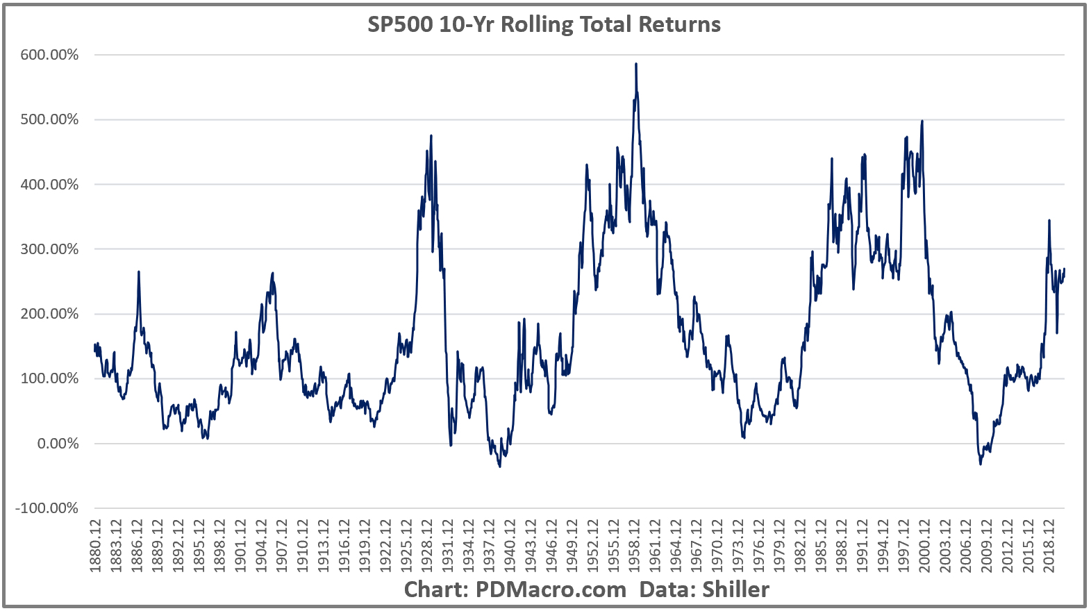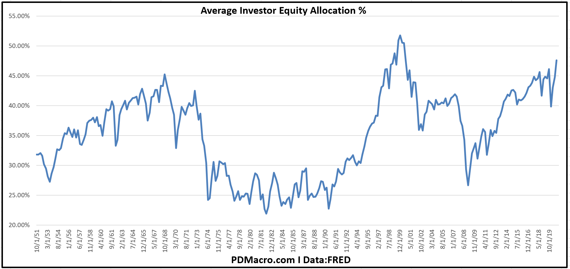 If you follow @Jesse_Livermore on Twitter, and you should, then you know that while he is an anonymous account he is also a great researcher and is very giving of his research. One of his pieces “The Single Greatest Predictor of Future Stock Market Returns” introduced the world to the “Average Investor Equity Allocation” model. This model does a fantastic job of forecasting forward 10-Yr returns based on Fed data on the investors allocation to equities. When everyone is into stocks, and that is a relative version of everyone, then stocks stink, and when no one owns them, they rock. Right now the model is saying that over the next 10 years the SP500 probably sees around 2%/yr. Not exactly awesome by YOLO standards, or even prudent investors standards.